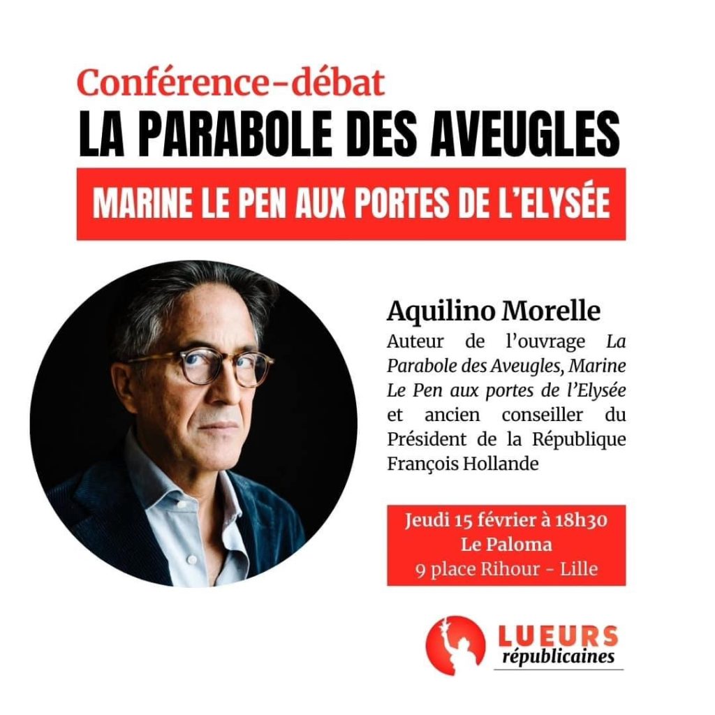 Aquilino Morelle, ancien conseiller politique du Président Hollande, et auteur de l’ouvrage « La parabole des aveugles, Marine Le Pen aux portes de l’Elysée » viendra échanger avec les participants au bar « Le paloma » , 9 place Rihour à Lille, ce jeudi 15 février à 18h30. Venez nombreux !